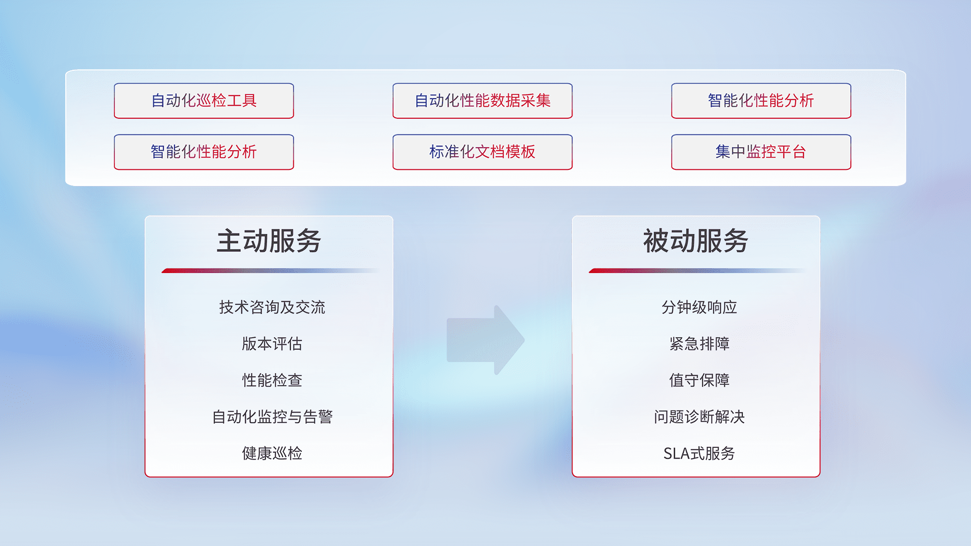 智能化工具和标准化文档,,,保障服务质量,,,,提供主动服务(包含技术咨询、、、、版本评估、、、性能检查、、自动化监控与告警、、、、健康巡检)和被动服务包含(分钟级响应、、、、紧急排障、、值守保障、、、、问题诊断解决、、、、SLA服务)。。。。