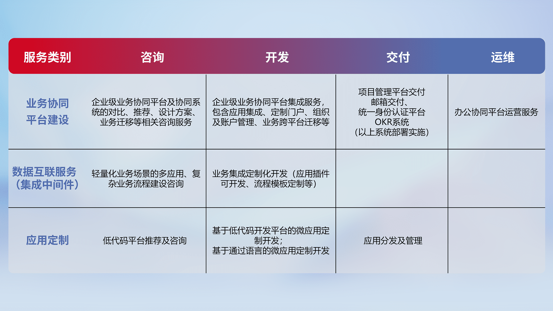 针对钉钉、、、、企微、、IDaas等平台级产品提供产品的规划、、方案、、、、交付、、定制化开发等服务,,,,实现如统一协同办公、、、、智能客户服务、、混合会议管理、、、智能数据查询、、等业务场景,,,,实现数字化转型。。。